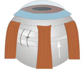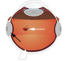 Şema 1: Yandaki şemada retinadaki yırtığı (beyaz ok) kapatmak için skleraya (gözün dış tabakası) eksplant (siyah ok) yerleştirildiği gösterilmektedir.