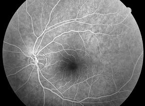Resim 1: Normal FFA görüntüsü. Damarlarda veya makulada herhangi bir sızıntıya ait parlak renkte beyazlık izlenmemektedir.