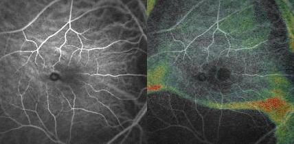Resim 1: Kliniğimizde ICG ve OKT simultane ( aynı anda ) incelenmektedir. Bu şekilde patolojinin yerleşimi ve yapısı birlikte değerlendirilebilir. Üstteki resimde ICG ile OKT tetkikinin birlikte uygulandığı koroid neovasküler membranı olan hastanın görüntüsü izlenmektedir.