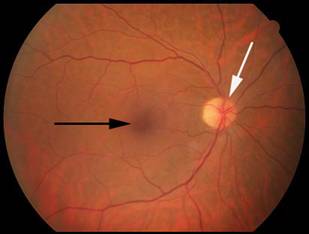 Resim 3: Normal retina görüntüsü. Makula (sarı nokta), siyah okla, optik disk ( görme siniri ) beyaz okla gösterilmektedir.